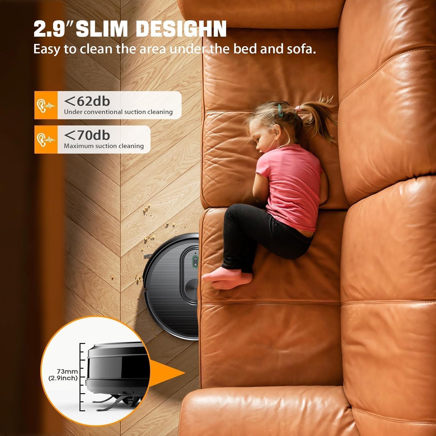- 🗺️🤸【Intelligent Obstacle Avoidance Upgraded Again】 The robot vacuum has an advanced 3D precise obstacle avoidance function, and a full set of infrared sensors can intelligently identify and avoid white walls, stairs, and obstacles. The robot vacuum cleaner can climb up to 15° and can easily cross door thresholds or carpets. A 3.27'' slim design helps the robot vacuum cleaner to reach every corner of a house or narrow space, clean leftover dirty areas, and keep your house neat.